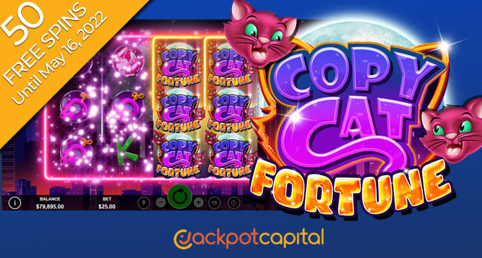 March 15, 2022 (Press Release) — The new Copy Cat Fortune slot from Realtime Gaming is coming to Jackpot Capital Casino on Wednesday. Its new Reel Copy feature, which duplicates stacks of matching symbols, is going to lead to lots of three-, four-, and five-of-a-kind payouts.